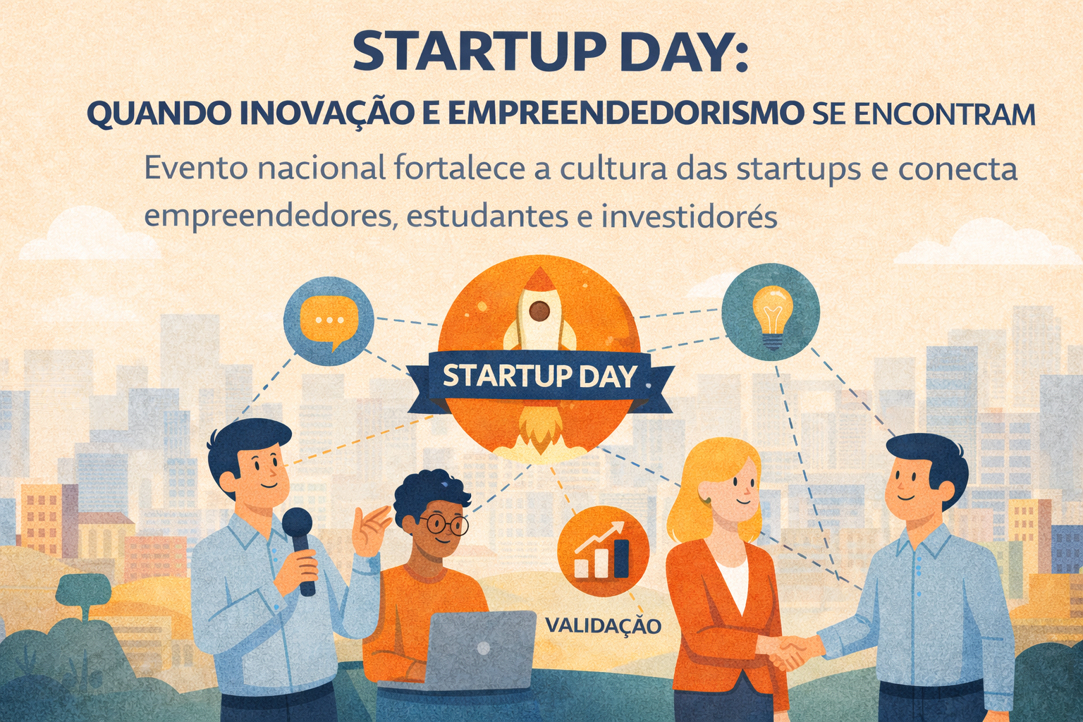 O Startup Day é um movimento nacional que ocorre simultaneamente em diversas cidades brasileiras, reunindo pessoas interessadas em inovação, tecnologia e criação de novos negócios. O evento promove palestras, painéis, oficinas e momentos de networking¹, criando um ambiente propício para troca de experiências e geração de oportunidades.